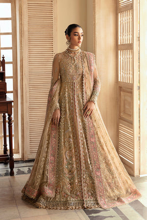 Capture the essence of elegance and festive charm with this stunning Dusty Gold-toned Peshwas, crafted from premium net fabric and paired with a graceful crushed silk sharara. Adorned with intricate detailing of sheesha, gotta, and pearls, this ensemble exudes regal splendor, making it a captivating choice for weddings and grand celebrations.