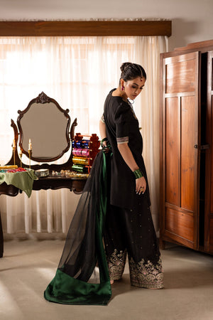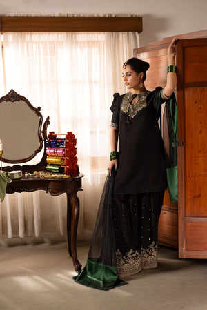 Ruhi is the epitome of festive elegance, a midnight black masterpiece tailored to perfection in luxurious Korean Silk. Delicately adorned with intricate hand-embellished embroidery, the artistry gracefully dances along the neckline, sleeves, and trousers, adding a touch of refined glamour. Complemented by an ethereal organza dupatta, accentuated with a striking vivid green border, this ensemble is designed to make a statement this Eid.