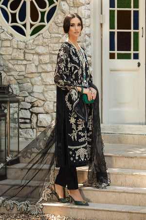 Organza fully embroidered long shirt with embroidered sleeves, Embellished neckline, border, and sleeves. Cotton satin straight trousers. Organza dupatta four sides embroidered border